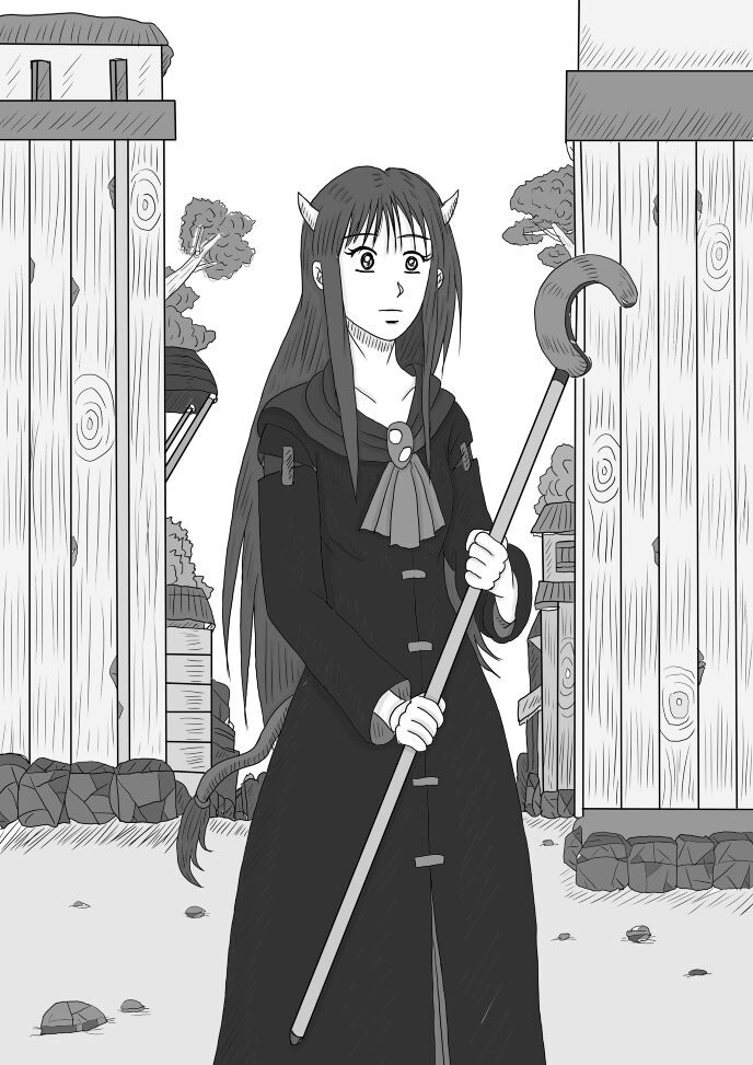 狼魔族のザドの前に立ちふさがる黒神子レスフィナの図です。
