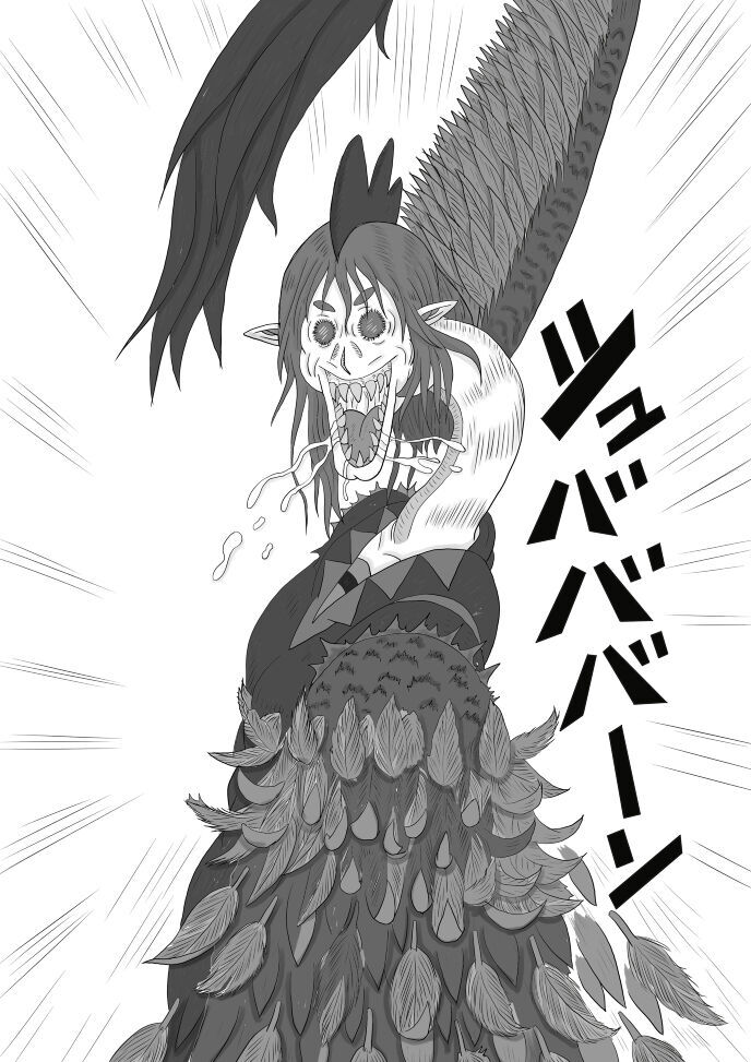 上空の空の上から悠然と下を見下ろす黒神子ヨーミコワはその長い足についた鋭い鉤爪を地上にいる黒神子レスフィナに向けて目標となる照準を定める。