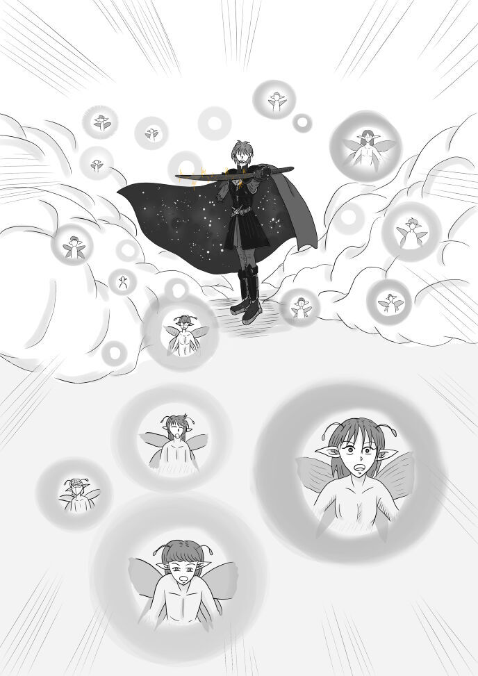 無限皇帝のマントと化した亜空間の中から、精霊エネルギーとなった今は亡き妖精達を解き放つラエルの図です。