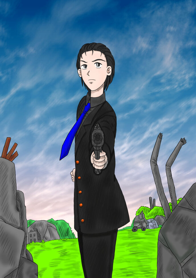 黒鉄の探偵が所有する武器、黒鉄の拳銃を構える黒鉄勘太郎の図です。