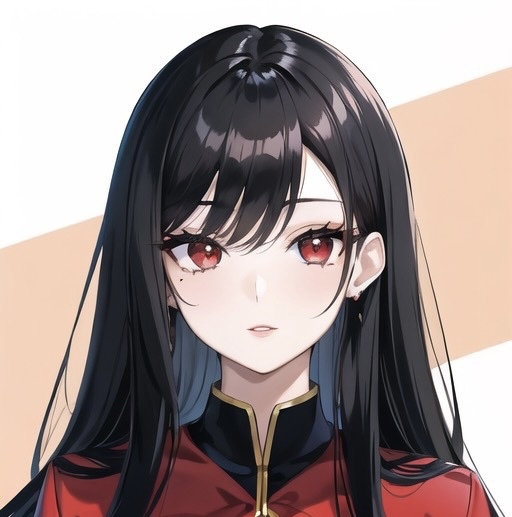 白い肌に黒髪、赤目、猫目(丸く端がつり上がってる)、まつ毛長い、鼻と口は小さい、赤い唇(瞳の色)、右目の端の下にホクロある