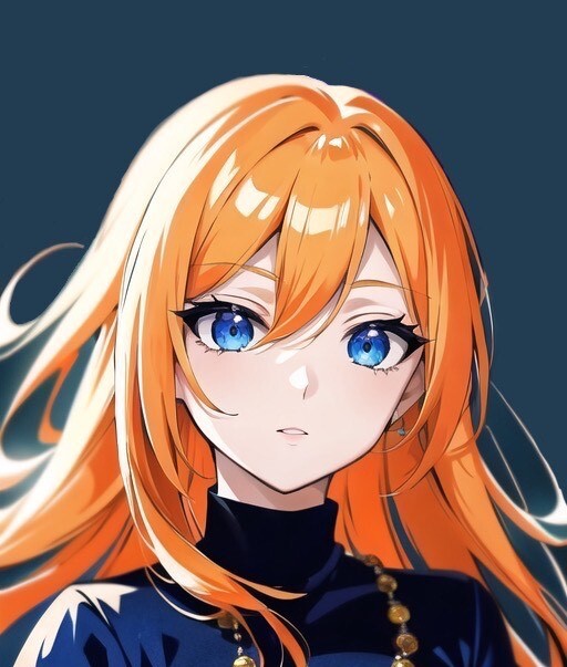赤橙色の髪、水色の目、ぱっちりお目目、まつ毛長い、赤橙色の唇(瞳の色)