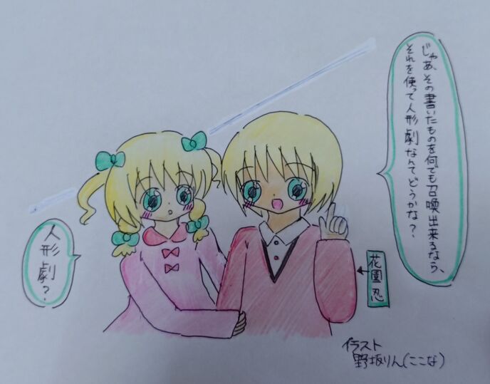 花園忍「じゃあ、その書いたものを何でも召喚出来るなら、それを使って人形劇なんてどうかな?」