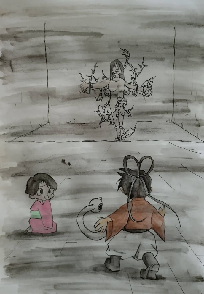根っこのような形の妖怪は、彼女の母親に侵入していた。
