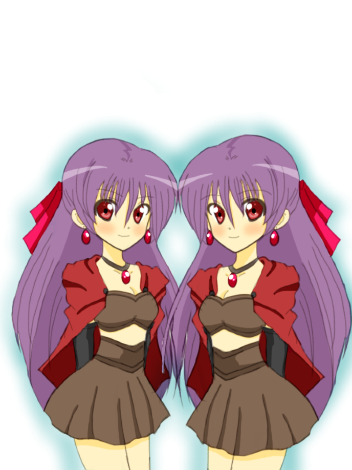 双子はロングヘアを赤いリボンでハーフアップに結び、お揃いの赤い石のアクセサリーを身につけている。