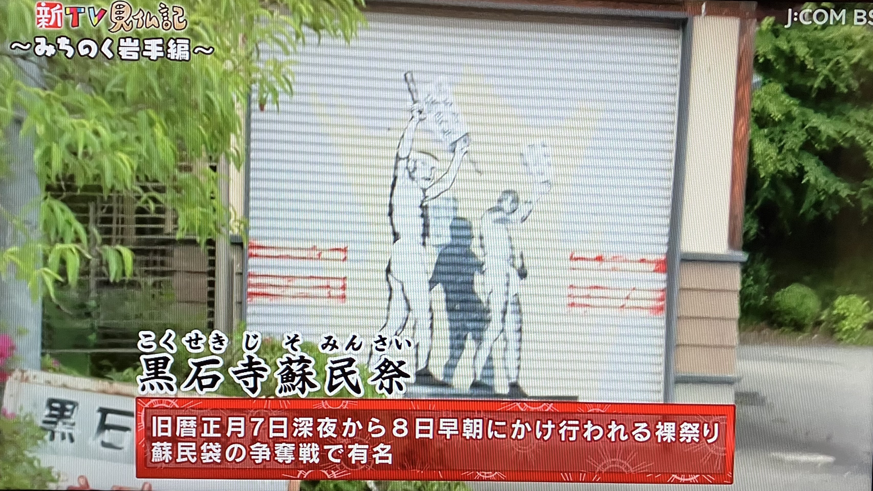 シャッターに黒石寺蘇民祭の男衆の絵が描いてある。