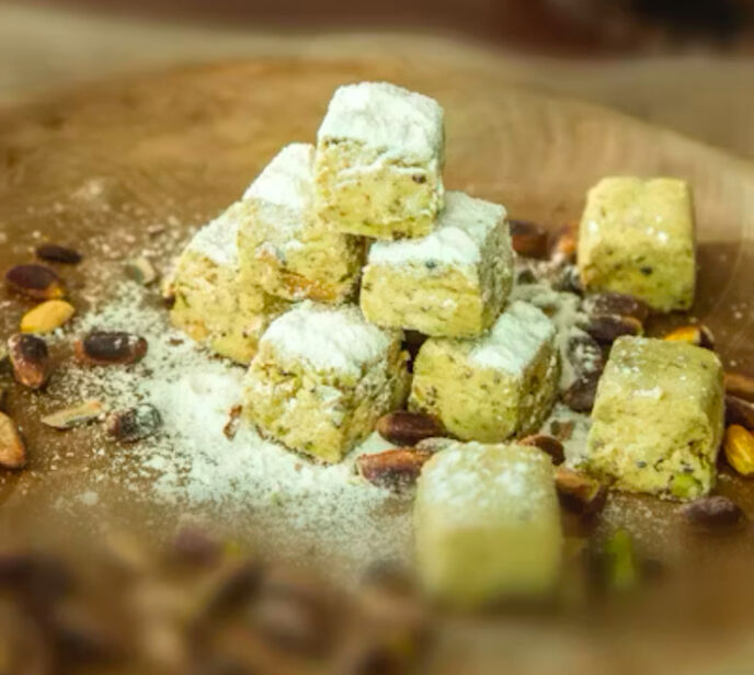 ピンク色のバラ風味・赤いザクロ風味・オレンジ色のオレンジ味・レモン色のレモン味・あるいは、蜂蜜入り・ピスタチオ入り・ヘーゼルナッツ入り、ミントの葉っぱ載せ。