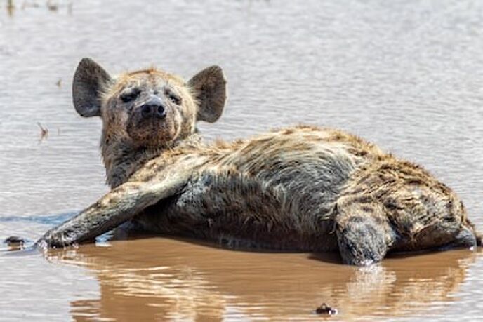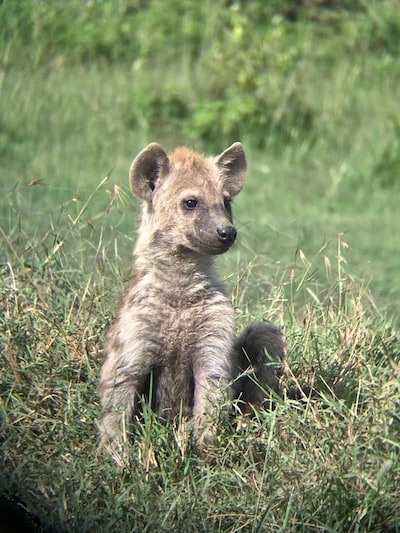 やっぱり、寄ってきたハイエナは人間に慣れてるようで、警戒せずに近づき、肉と間違えたのか、カメラをカプって噛む。食べれない奇妙なブツに驚き、慌てて離れた。