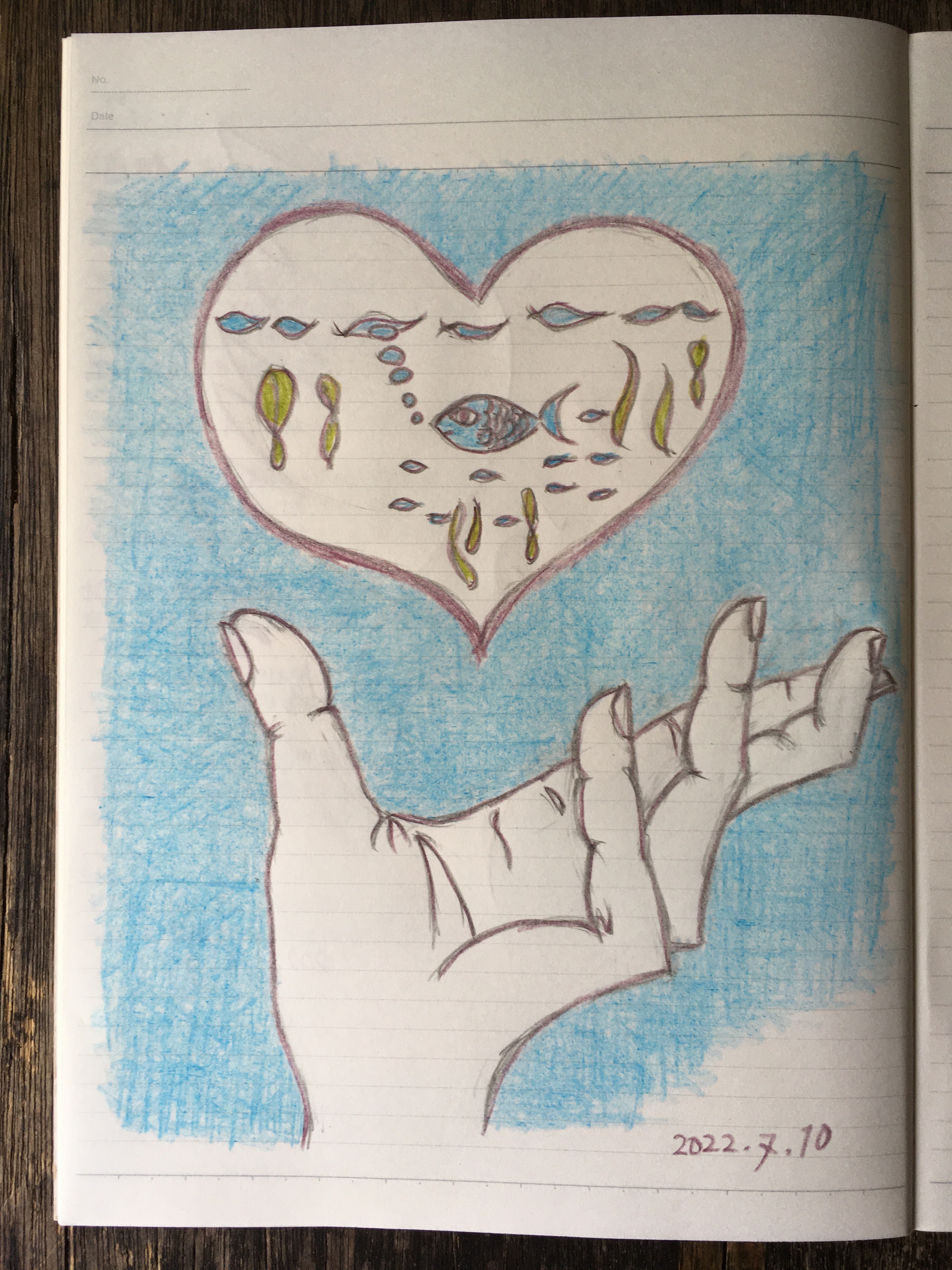 ハートの形の中、中央の魚以外の水色の生物が謎。ヒゲの生えたナメクジみたいな形よね? なんなんやろー。