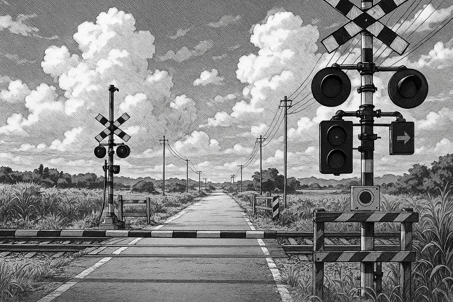 遮断棒はすでに下がりきっており、しかし列車の姿はどこにも見えない。