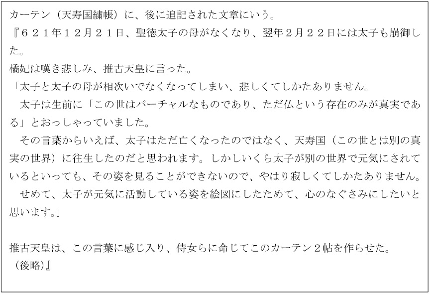 ただし、布や絵(刺繍)については言い伝え通り太子薨去ごろの作品であると推測されるが、文章の文字の使い方や語句などから、文章はもっと後の時代に作成されたのではないか、とも言われている。