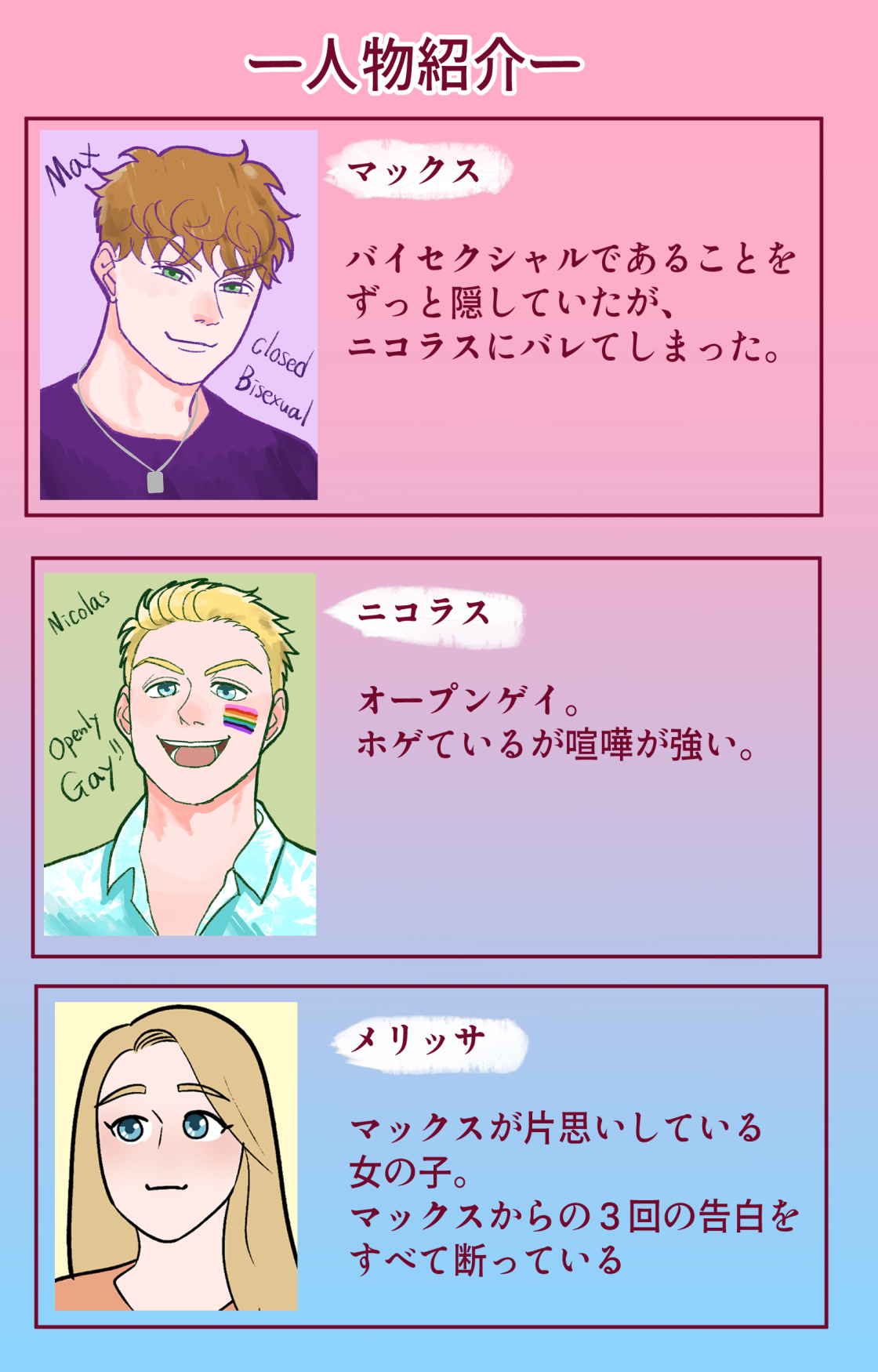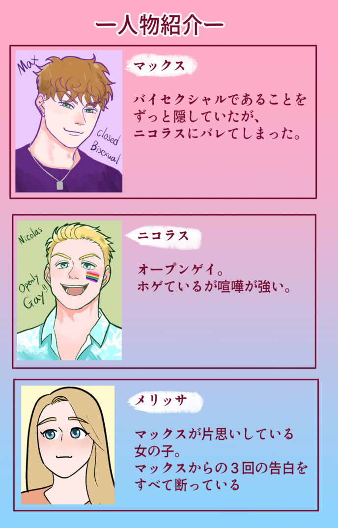 バイセクシャルの自分とゲイのニコラスでは、世界の見方がちがうかもしれない。カモフラージュができるバイセクシャルとは違い、外面的な悩みはゲイのほうが強いだろう。