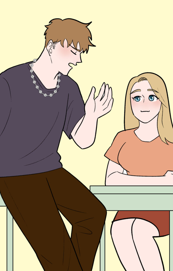 マックスは教室に入り、彼女の席に近づく。