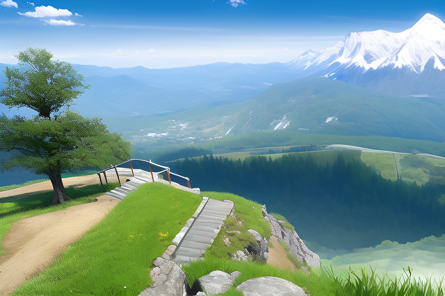 展望休憩所。山脈からの絶景が見えるベンチに、自動販売機が一つ。