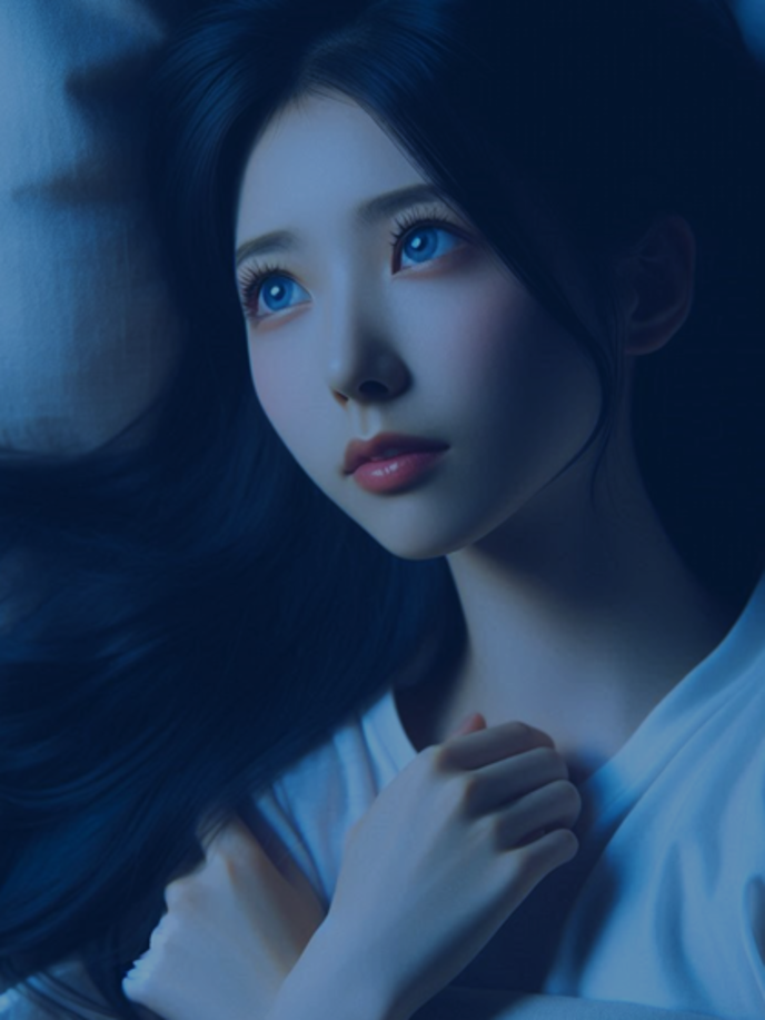 不意に、ベッドの縁から、彼に向かって彼女は顔を出した。部屋の暗闇に、彼女の青い瞳がぼんやりと光っているように見えた。