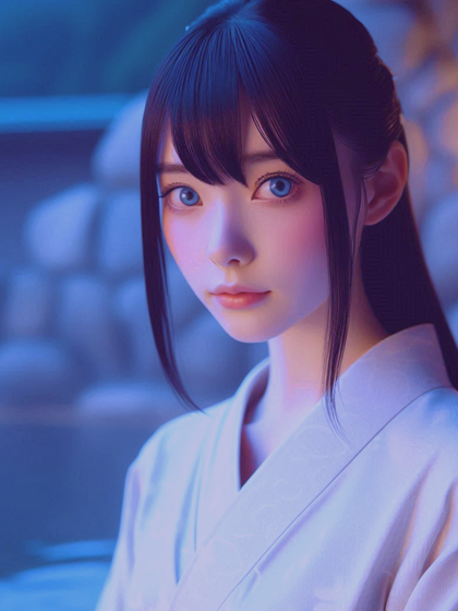 月明かりの中、浴衣のままの彼女が湯殿に膝を付き、湯気の立ち上る露天風呂に右手を漬けていた。彼に気付いて一旦顔を上げたが、再び目線を揺らめく湯面に落とす。彼は彼女に近づいた。