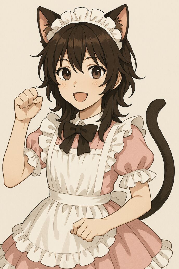 元が中性的な顔立ちなので、淡いオレンジの色付きリップを引いただけでボーイッシュな少女に仕上がる。短いピンクのフレアワンピース。幾重にも重なったパニエがスカートをふんわりと広げている。白いフリルのエプロンは機能性よりも見た目を重視しているようだった。同じく白のブリムには黒の猫耳が付けられ、スカートの下からは黒い尻尾が見えている。