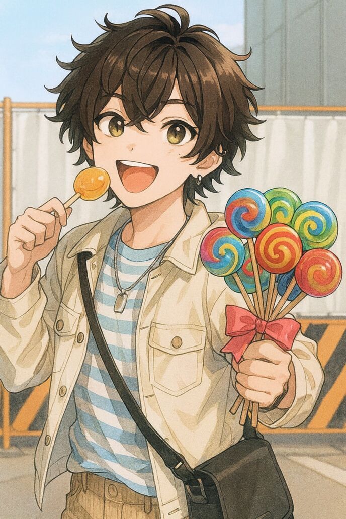 驚いて振り向くと、十五─六の少女のような面立ちの少年が立っていた。左手に数本のポップキャンディを持ち、右手には舐めかけのキャンディを持っている。