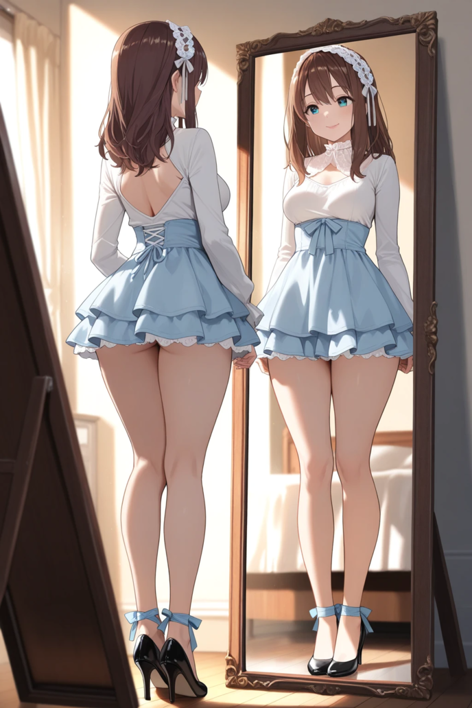 次に服を選ぶ。僕が選んだのは、白いモックネックのブラウスと、体のラインがはっきりとわかる、淡い水色のミニのタイトスカート。