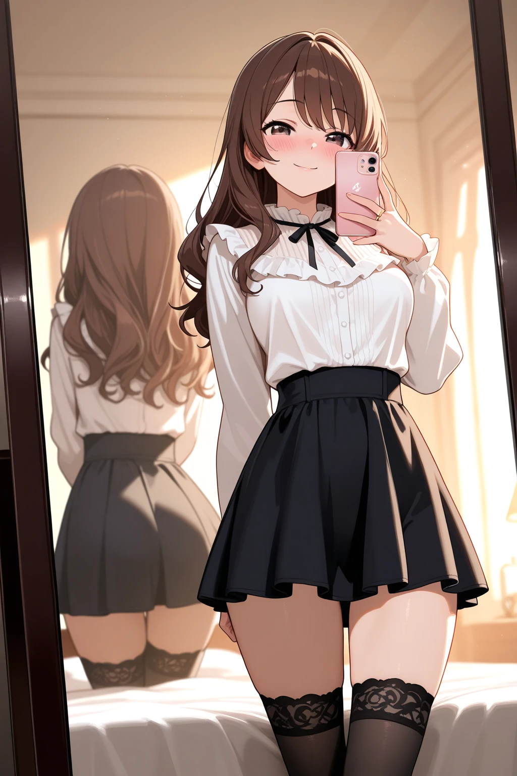 次に、黒のミニスカートを履く。つるりとした生地がヒップの丸みを包み込み、ジッパーを上げる音が生々しく響く。スカートの裾は驚くほど短く、太もものほとんどが露わになった。鏡に映るその大胆な姿に、背徳感で口の中が乾く。