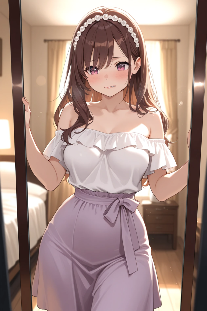 僕が選んだのは、オフショルダーの白いブラウスと、上品な淡い紫色のフレアスカート。