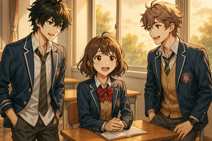 そのとき予鈴のチャイムが鳴り、リクは急いで教室に向かった。どの教室からも生徒たちの声が聞こえいた。リクは3年1組の教室に入ると、席に座っているナオの横でケントが話しかけているのが見えた。リクは教室に入るときに思った。