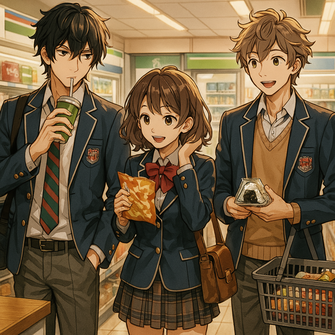 次の週末の朝、3人は弥生神社に向かっていた。神社に行く途中にコンビニがあった。