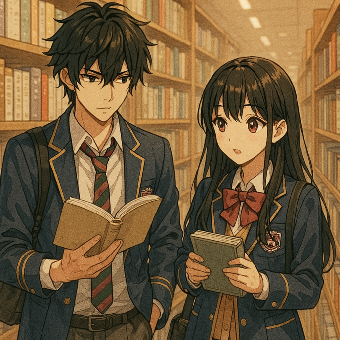 2人は店内を歩いた。アリスは小説コーナーで立ち止まると、真剣に本を選び始めた。リクはアリスの真剣な横顔をチラチラ見ていた。