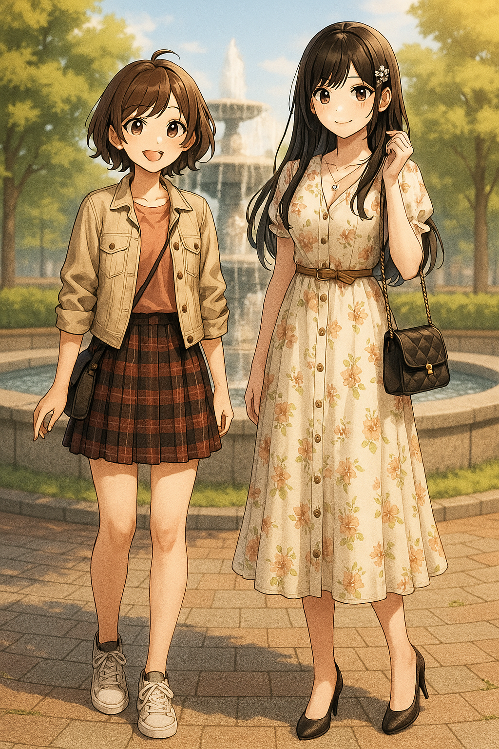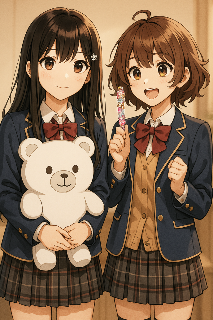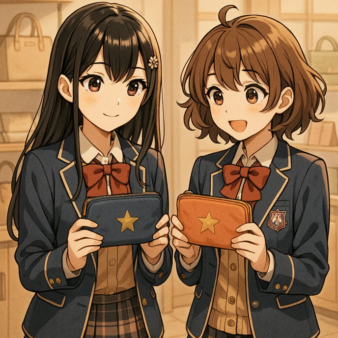 ある日、ナオとアリスは学校帰りに近所の雑貨屋さんに立ち寄った。小さなお店の棚には、かわいいポーチやアクセサリーが並んでいる。ナオがキラキラした目で一つのポーチを手に取り、アリスに見せた。