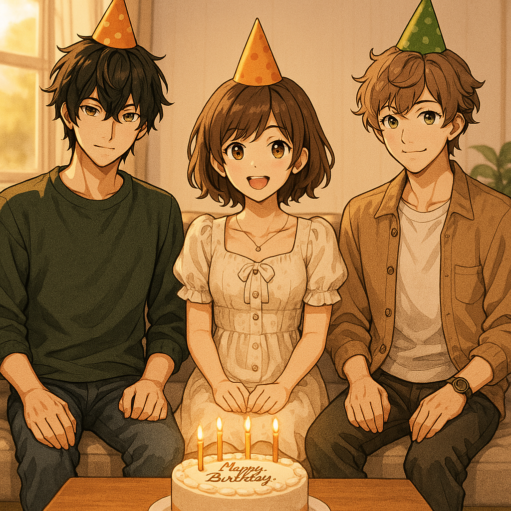 最後に3人は記念撮影をした。ナオの横には人1人分の場所が空けられていた。その場所はアリスが座っているはずの場所だった。ナオは左手でアリスの分の帽子を持って、アリスの頭の位置に持っていった。そしてナオは言った。