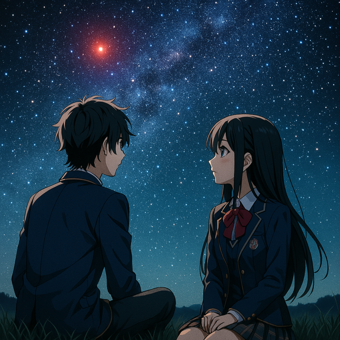 星空が静かに輝く夜。リクとアリスは目の前に広がる壮大な宇宙に思いを馳せていた。