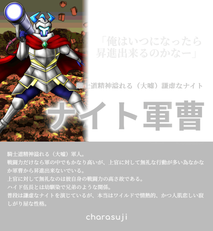 真面目で謙虚なナイトを演じているが、素の性格はわりと気さくだから接しやすいぜ。