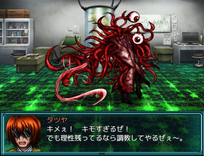 胴体は白衣を着た人間のようだが、両腕と首先から無数の触手が生えている。首からは目玉の生えた触手が2本生えていて気持ち悪いぜ。