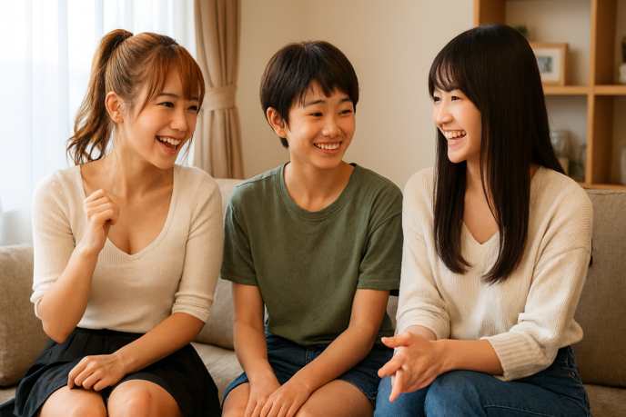 ソファには、ギャル系のミニスカートコーデの桜井 杏奈と、ボーイッシュなショートパンツ姿の青木 莉子がくつろいでいる。
