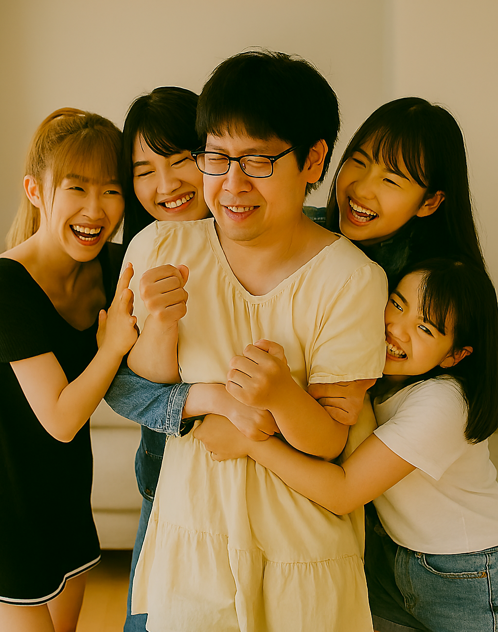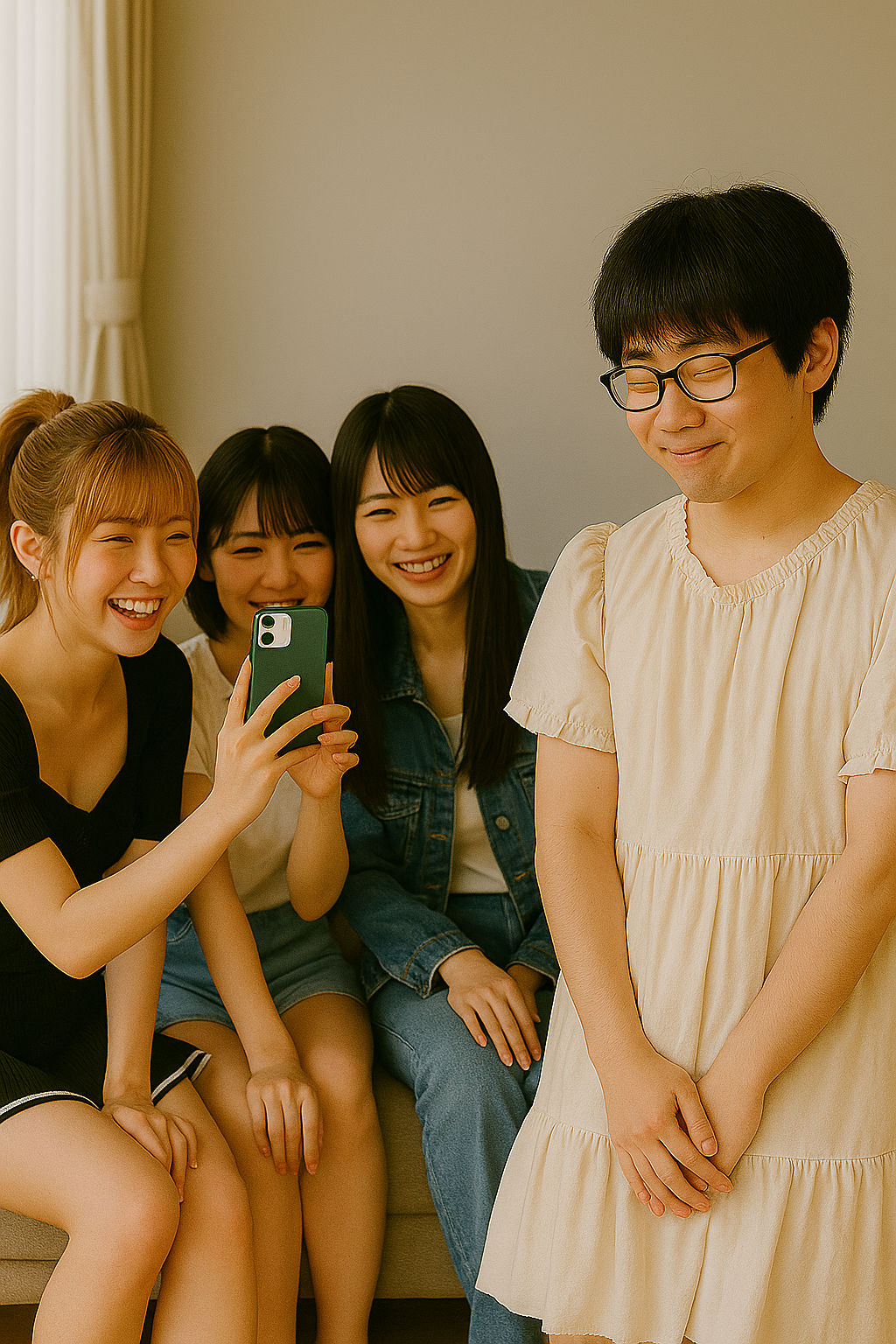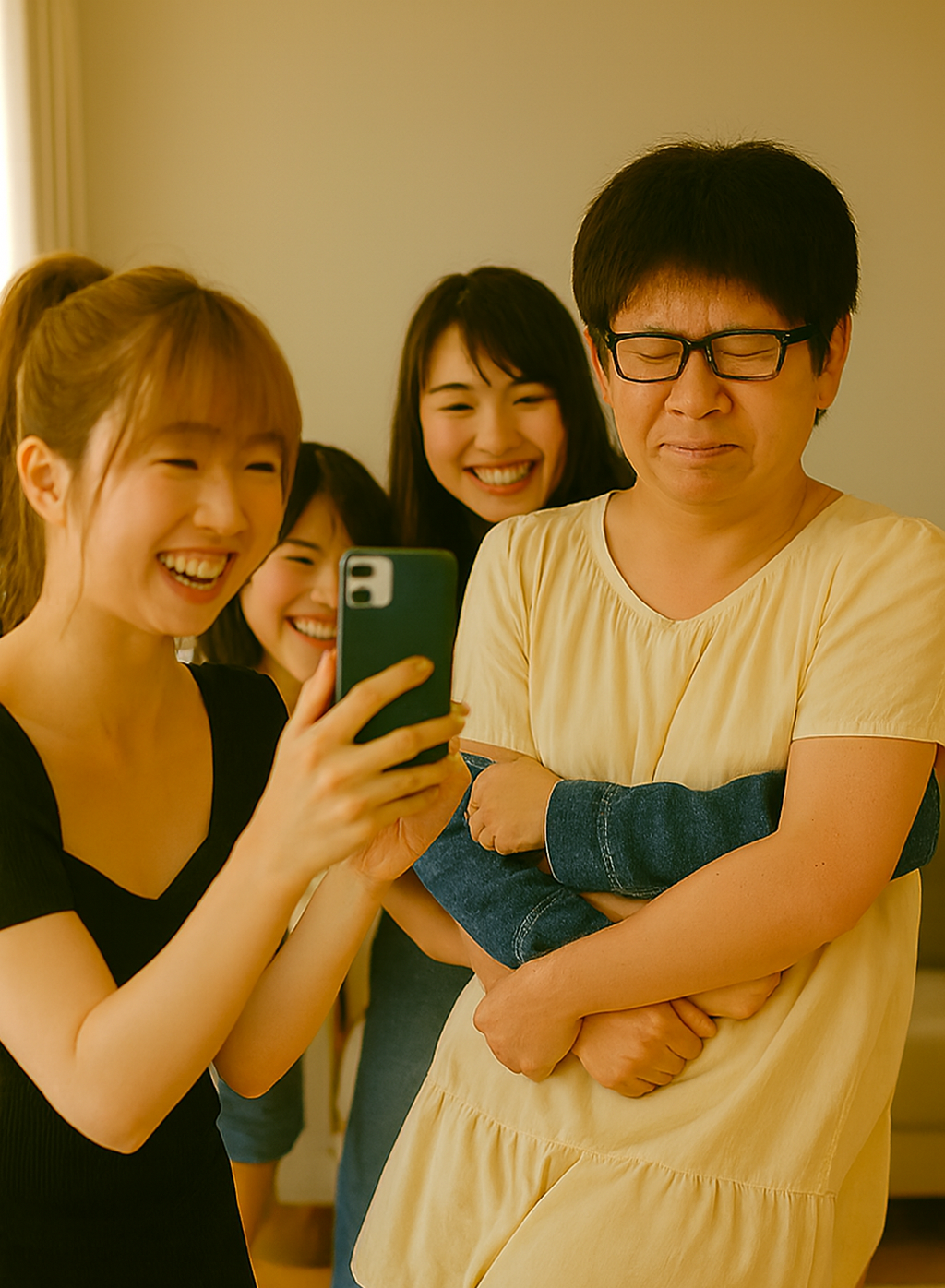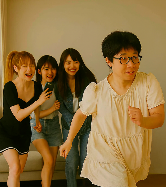 女子たちは、彼を離さないまま、スマートフォンを構えて連写を始めた。