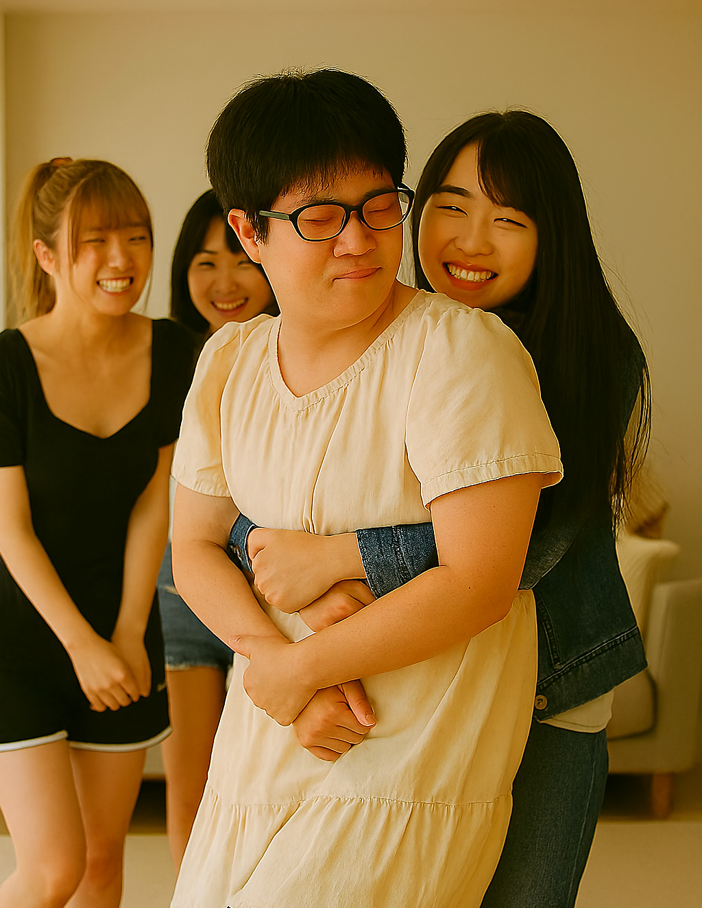 体格の小さな湊は、女子3人の抱擁で完全に身動きが取れなくなる。