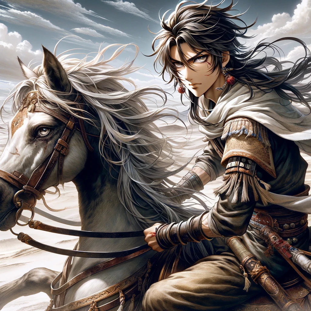 その先頭を行く、ひときわ精悍な馬。その上には長い黒髪をひるがえし、ひときわ目立つ鎧をみにつけた青年がいた。