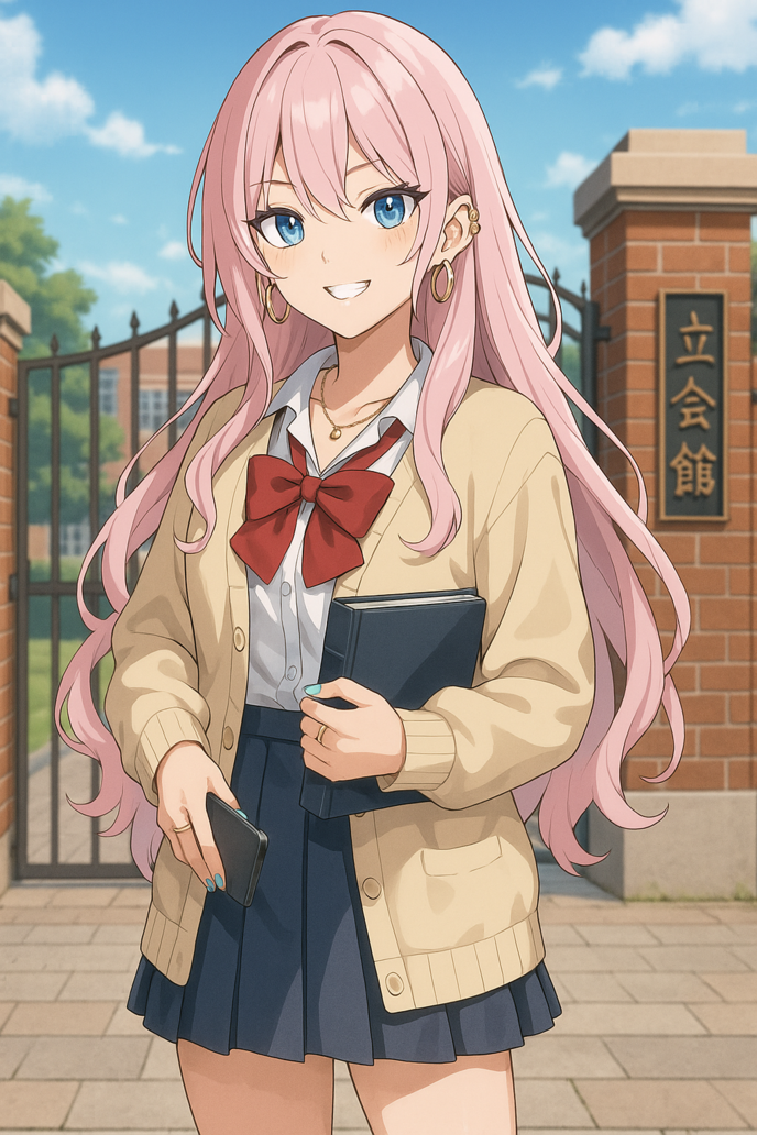 カーディガンをゆるく羽織り、制服のスカートは規定より短く、足元は白ソックスと厚底ローファー。