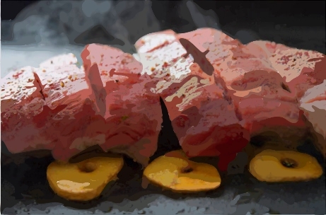 いよいよ、肉に取り掛かる。フライパンに牛脂を落とし、スライスしたニンニクを入れる。焦がさないように注意するのがポイントだ。程よくニンニクが茶色になったら、それを一旦取り出し、残った〈ガーリックオイル〉で肉を焼く。両面に岩塩を振った厚切り熟成肉をフライパンに置くと、ジュゥゥゥッという音と共に肉とニンニクの香りが周囲に広がる。堅い黒パンや干し肉程度を食んでいる他の旅人たちが、唾を飲み込みながらコッチを注視している。いや、お前らにはやらんぞ?