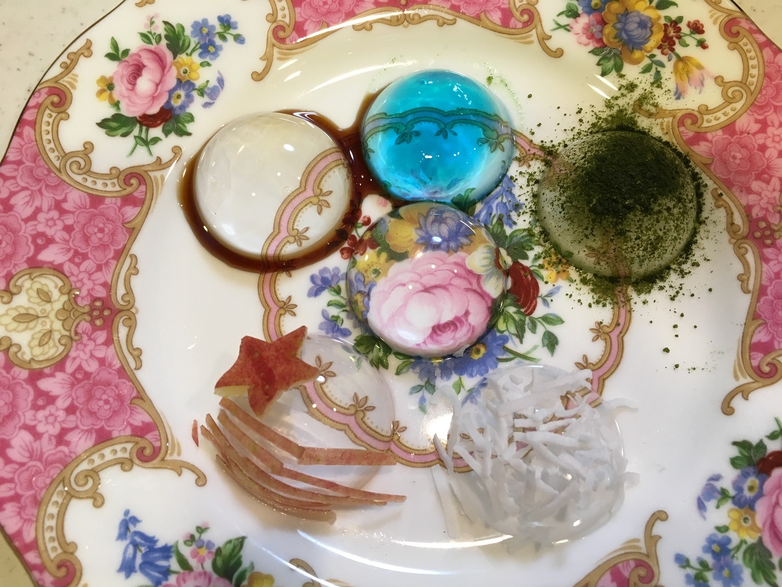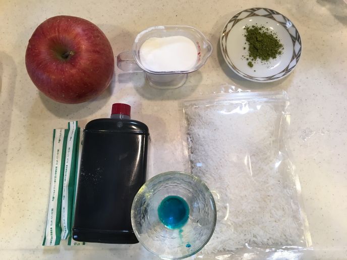 デコレート リンゴの皮(中身は食べます)、ブルーハワイシロップ、黒蜜、抹茶(砂糖混ぜる)、ココナッツパウダー