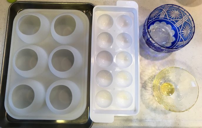 ※器は丸い氷が出来るアイストレイの大と小を用意しました。湯呑等でも代用できます。