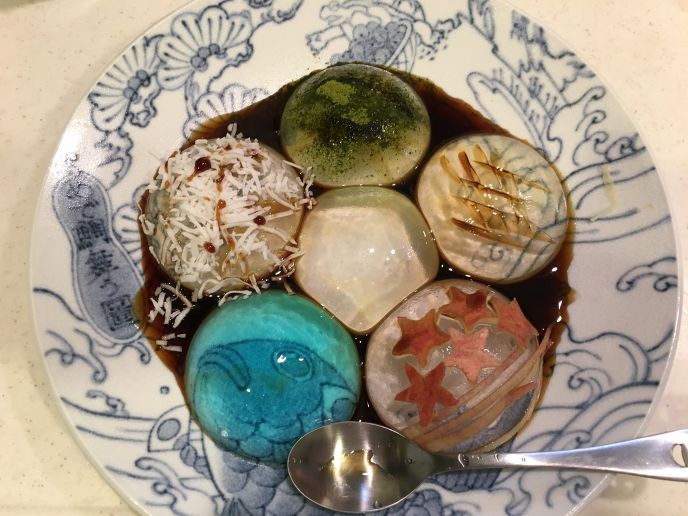 色を付けてしまうと折角の美しさが半減してしまうので、本家の通り黒蜜きな粉か、下にフルーツを敷くのが良いですね。