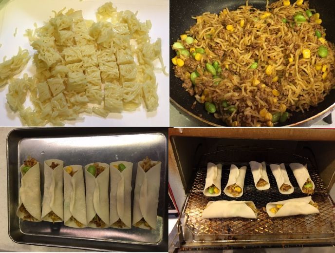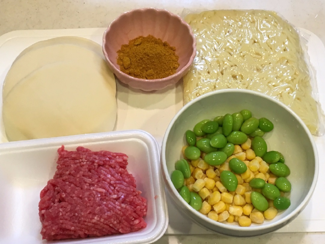 材料:焼きそば麺、ひき肉100g、冷凍コーン、冷凍枝豆、カレー粉(大さじ2)、餃子皮(大判20枚)