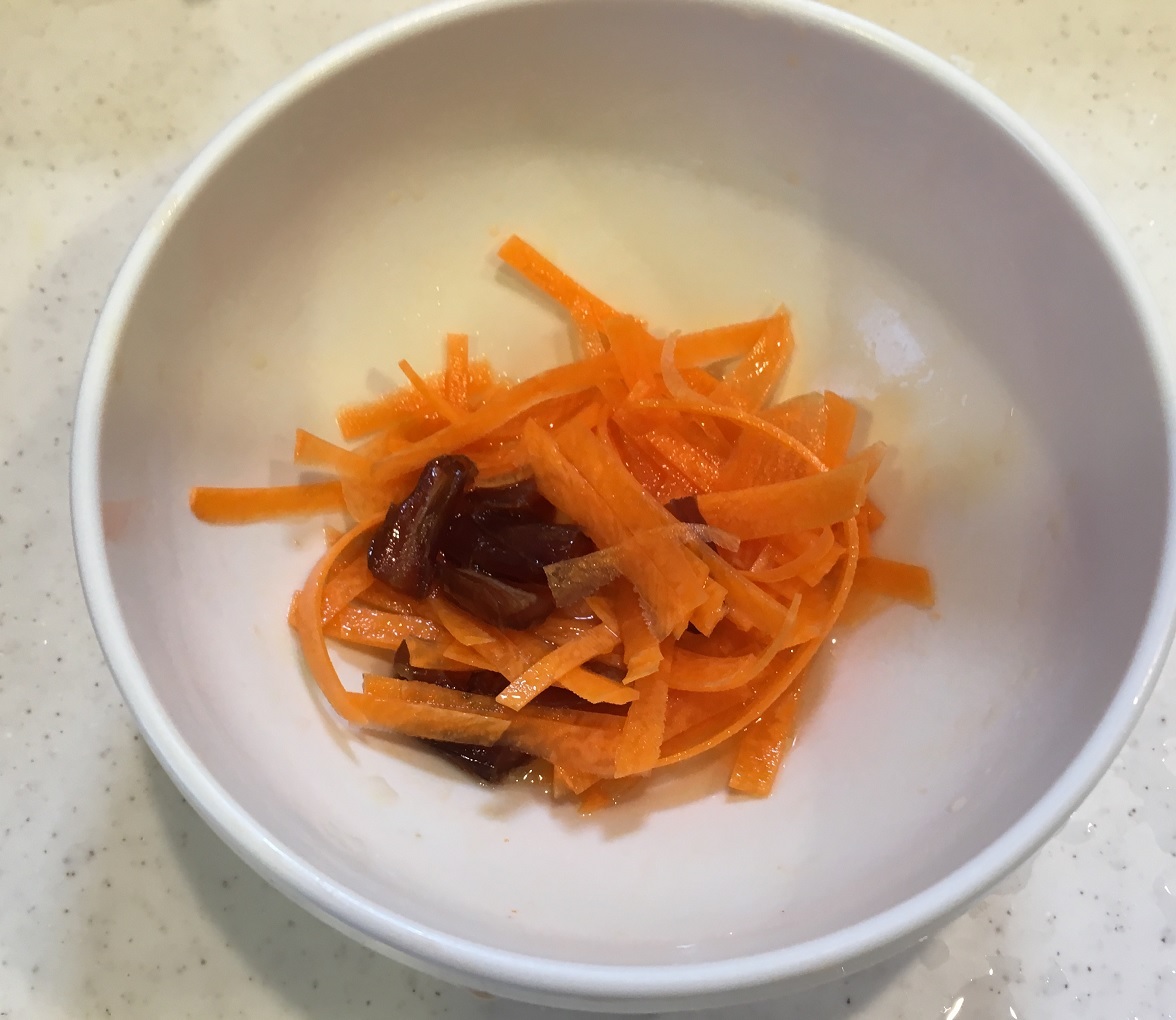 1.人参とデーツを千切りにして、リンゴ酢とオリーブオイルを小さじ1ずつと混ぜてサラダというかマリネにします。