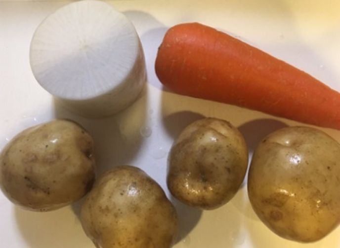 材料:ジャガイモ、ニンジン、大根、マヨネーズ、塩、コショウ、ドレッシング