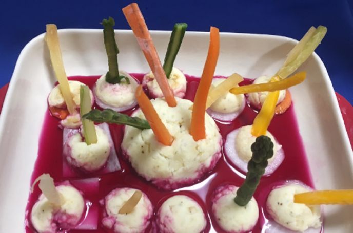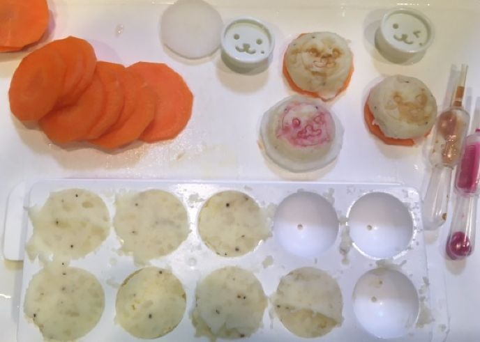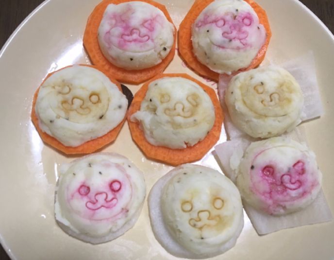 2.ポテサラを型に入れて、半球状にしたら、スライスした人参と大根に載せ、市販のキャラ弁用スタンプを押します。
