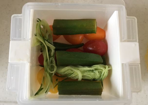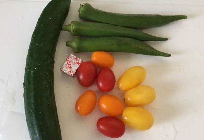 材料:オクラ、キュウリ、ミニトマト、コンソメキューブ、ゼラチン