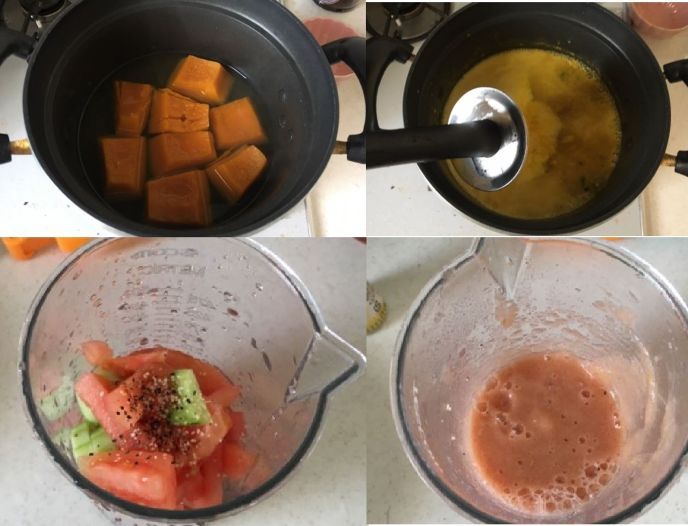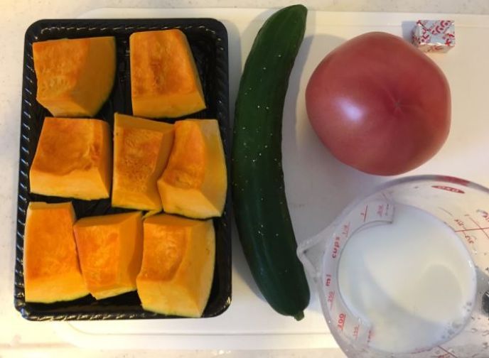 材料:カボチャ(6分の1)、トマト(中1個)、キュウリ(2分の1)、牛乳(100ml)、コンソメキューブ1.5個、ゼラチン、ワインビネガー、塩、黒胡椒