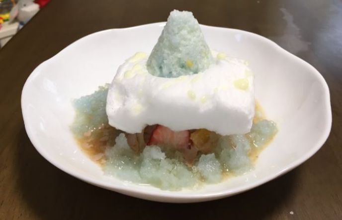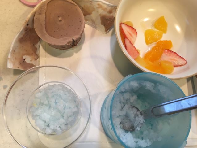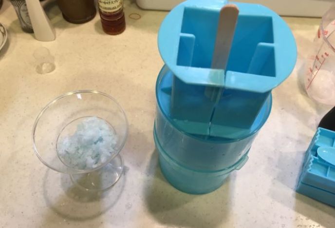 2.ソーダ味アイスを、ソーダ味アイスをかき氷にするマシーンを使ってかき氷にします。