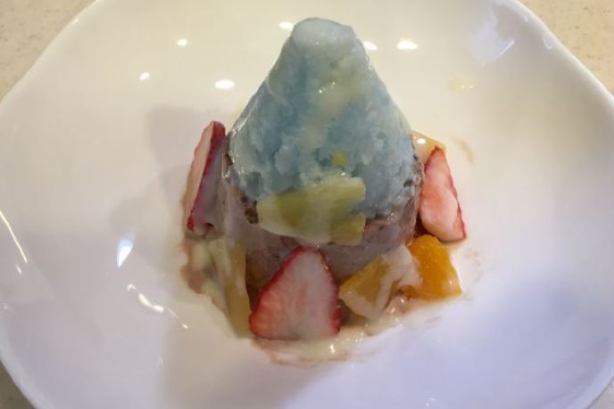 4.凍らせたフルーツでデコレートして、わたあめと練乳をかけてデコレートします。